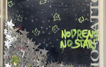 Note: GIO' GATTO utilizza per le sue opere gli sfridi della sua attività. In quest'opera gli sfridi sono stelle di carta ritagliate ed inserite tra il quadro ed il vetro, muovendo l'opera le stelle passano da destra a sinistra e/o viceversa rinnovando l'immagine dell'opera.